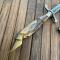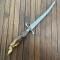 STYLET AVEC MANCHE EN CORNE NATURELLE SCULPTÉ EN PIED DE BICHE. GARDE ACIER DEUX QUILLONS INVERSE EN S, , LAME ACIER COURBE INCURVÉE DE 11,2 cm CRUCIFORME 4 PANS , longueur totale 22 cm. AVEC SON FOURREAU À ANNEAU BALLANT EN MAILLECHORT.