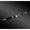 Manche en corne gravé à colonnettes et décoré d’un empilement de bagues de laiton. Mitre lisse, virole en maillechort, à quatre palmettes gravées.