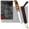 Superbe, dague poignard couteau finlandais dit '' Puukko '', datant du milieu du XX - 1950 (?). La poignée est en bois sculptée orangée. Marqué sur le fourreau : '' MADE IN FINALND ''. La lame est en très bon état, encore brillante, joli dos de lame somptueusement taillé. Le fourreau est en cuir brun et garniture en bronze doré, dans son jus. Superbe pièce, très agréable à tenir en mains et encore plus à observer en vitrine !