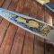 Pommeau laiton , manche bois de cerf massif sculpté de gibier , virole laiton cannelé , lame tranchante à finition satinée gravée d'une scène de chasse , sangliers et feuilles de chêne à la dorure .