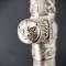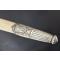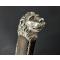 Dague de vénerie époque Directoire Consulat et premier Empire montée en argent. Poignée en corne brune quadrillée en façades et rainurées sur les bords, bordées de colonnades perlée en argent, un petit manque en bordure sur la partie inférieur. Pommeau à tête de lion à belle crinière, gueule et yeux finement ciselées, virole basale sculptée de branches de feuillages, forte croisière rectangulaire à fonds perlés laissant apparaitre des sangliers repris en gravure, guillons droits bordés de coquille Saint Jacques et de section circulaire à flancs godronnés et extrémité ciselées de visages fantastiques, entrée de chape ciselée de volutes. Solide lame de 54cm à double tranchants et arrêtes médianes à flancs légèrement incurvés, gravée d'initiales L et G, fines traces d'oxydation sans grand dommage. Fourreau bois recouvert de parchemin blanchâtre et de deux garnitures en argent repoussées en suite de la monture finement ciselées et godronnées de feuillages, de coquilles Saint Jacques stylisées, bouton de suspente en argent, dard ovoïde décoré de feuilles. Longueur totale 75cm