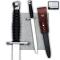 Rarissime et superbe dague / poignard Suisse de la Waffenfabrik. Poignée en bakélite noir (ou en plastique) et en acier, pas de jeu, très solide et massive. Lame brillante à une gouttière centrale avec des traces dûes au temps, utilisée. Marquée au talon '' F+W dans un cercle '' + '' V 113279 ''. Fourreau en acier recouvrt de cuir, estampillé à l'entrée en calligraphie de la lettre '' P '',bronzé complet avec son tres rare baudrier en cuir brun, estampillé '' P. BRAUNWALDER BRENHARDZELL 87 ''. Une superbe pièce totalement et 100% originale, en superbe état de conservation ! Très agréable à tenir en mains et encore plus à observer en vitrine ! ATTENTION : vente provisoire, le couteau sera mis en vente sur un autre support s'il ne trouve pas d'acheteur sur le site !