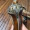 Monture en bois de noyer à fut long embout capucine en corne , crosse sculptée : queue de culasse avec fleurs de Lus stylisée, fût également sculptée de motifs , petit empiècement à l'oreille droite , baguettes en bois .
