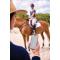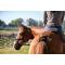La sangle de poignet s'ajuste autour du canon antérieur, ou s'intègre dans un bracelet licol dédié. Léger et stable, il ne gêne pas la circulation ou le confort.