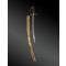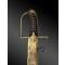Garde en laiton fondu, calotte à longue queue à filets et bouton de rivure. Arc de jointure plat, arrivant à angle droit sur la croisière et terminée par un bouton à facettes. Poignée recouverte de basane à filigrane torsadé disposé en chainette. Oreillonsovoïdes.
