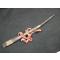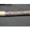 La poignée noire en bois est superbement sculptée par un entrelac de motifs floraux : elle est liée à la lame par un anneau de laiton décoré de part d'autre par un fin filigramme.