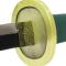 La garde de ce sabre est constituée d'acier et de bois et le manche est recouvert d'un tressage vert.