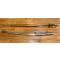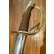 Sabre de cavalerie légère modèle 1822. Poignée recouverte de cuir avec filigrane. Monture en laiton, garde à trois branches, cravate à la garde. Lame courbe à dos plat (vierge, sans marquage) et pans creux poinçonné. Fourreau en tôle de fer à deux bracelets au matricule de la garde. Très bon état, aucun point de rouille ou crevasse.