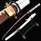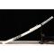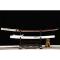 La construction du Habaki est en laiton monobloc. Le Tsuka (poignée) est enveloppé de fausse peau rayée et de soie synthétique Ito. Le saya (gaine) en bois dur est complété par un Sageo attaché autour du bouton en cuivre brillant. Parfait pour l'iaido et le kendo supérieur.
