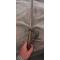 Sabre court probablement dévolu à l'usage dans la marine marchande, lame à la Montmorency avec pointe large dans l'axe de la lame et à contre tranchant, décor au trait en partie effacé portant couronne, arme montée fer, calotte à longue queue, pommeau plat en amande avec rivure de la soie au centre, branche de garde principale se subdivisant en deux branches secondaires arquées en "S" joignant la croisière à angle droit pour la branche principale, fusée bois lisse fendue et recollée, pas de fourreau. Longueur 795 mm.