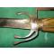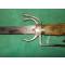 Sabre traditionnel marocain à lame courbe dit NIMCHA, sans fourreau. Ce type de sabre est beaucoup moins courant que le Nimcha à lame droite mais est néanmoins répertorié par des experts spécialisés (1). Il est, je pense, du 19ème. La pièce de garde est ornée d’un décor de fil d’argent incrusté dont une partie à disparu. La lame me parait être de fabrication européenne ce qui n’est pas rare sur ce genre d’objet. L’ensemble à une longueur totale de72,5 cm, la lame mesure 58 cm pour une largeur au talon de 35 m/m et une flèche de 24 m/m. Cette lame peut sembler courte, mais certains auteurs décrivent ce Nimcha avec une courte lame courbe.