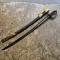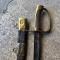 Fourreau en cuir d’origine avec deux garnitures en laiton martelé, chacune munie de son anneau. Cuir légèrement usé mais complet et conforme à la période.