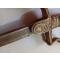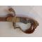 Poignée recouverte de galuchat avec filigrane. Monture en laiton ciselé, pommeau à la tête de lion aux yeux de verroterie, garde à la Blücher et demi-oreillons. Lame à dos baguette ramené à la pointe signée « EWALD SOLINGEN » gravée au tiers de rinceaux feuillagés, faisceau de licteur et d’une aigle impériale (dans le style français) sous couronne impériale allemande. Longueur : 97 cm. Sans fourreau