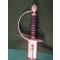Sabre d'officier anglais court, vers 1775/1780. Connu sous son modèle à quatre fentes. Il possède une large garde en forme de « D » avec un quillon arrondi et quatre panneaux percés, deux de chaque côté de la poignée. La face arrière de son arceau porte normalement des cannelures verticales.Poibnée bois recouverte á cuir avec filigrane, Pomme, guard, et garnitures d´argent .Fourreau en bon état.Lâme avec une canelure.Pas de marquages.Il s´agit d´un modele aussi dans la Guerre Revolutionaire aux États Unis, mais manufacturer en Angleterre.