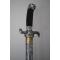 Beau sabre de vénérie à fusée en ébène cannelé. Pommeau en argent figurant une gueule de grand fauve. Garde en argent à deux quillons en représentation de têtes de chien de chasse. Egalement sur la garde, une hure de sanglier et une tête de cerf.