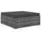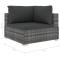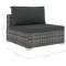 La livraison comprend 3 canapés d'angle, 5 canapés de milieu, 2 repose-pieds, 1 fauteuil, 2 tables basses, 13 coussins de siège et 12 coussins de dossier. Remarque : Nous recommandons de couvrir l'ensemble sous la pluie, la neige et le gel.