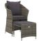 Salon de jardin 2 pcs avec coussins Gris Résine tresséeProfitez d'un moment agréable dans votre espace extérieur avec cet ensemble de salon de jardin ! C'est un complément parfait à votre jardin et à votre terrasse, créant une impression durable ! Matériau haut de gamme : la résine tressée est un matériau de résistance exceptionnelle et durable dans différentes conditions météorologiques.Cadre en acier : le cadre en acier assure la robustesse et la stabilité de l'ensemble de salon extérieur.Coussins moelleux : les coussins épais et amovibles du salon de jardin sont inclus pour offrir le plus grand confort d'assise.Accoudoirs et dossier confortables : le dossier et les accoudoirs ronds permettent à vos bras et à votre dos de se reposer confortablement.Tabouret pratique : vous pouvez vous détendre et y mettre vos pieds grâce au tabouret inclus. Vous pouvez également placer le tabouret n'importe où, selon vos préférences. Remarque :Chaque produit est livré avec un manuel de montage dans la boîte pour un montage facile.Afin de prolonger la durée de vie de votre mobilier d'extérieur, nous vous recommandons de le protéger avec une housse imperméable.