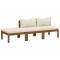 Salon de jardin 3 pcs avec coussin crème Bois d'acacia solideCe mobilier de jardin en bois est une combinaison parfaite de style et de fonctionnalité. Avec cela dans votre jardin, vous pouvez passer du temps relaxant et apaisant avec votre famille et vos amis. Doté d'un cadre en bois d'acacia massif, l'ensemble de canapé est solide, robuste et durable; et sa finition à l'huile rend l'ensemble de canapé adapté à une utilisation en extérieur. Les coussins amovibles sont bien rembourrés, afin d'offrir un grand confort d'assise. Une table basse au design à lattes unique est également incluse. De plus, grâce à sa conception modulaire, toutes les pièces peuvent être arrangées et personnalisées selon vos besoins. Cet ensemble de sièges d'extérieur sera sûrement le point de mire de votre jardin ou patio. Remarque : afin de prolonger la durée de vie des meubles d'extérieur, nous vous recommandons de les protéger avec une housse imperméable.