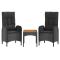 Salon de jardin 3 pcs avec coussins Noir Résine tresséeCet ensemble de salon de jardin tendance, au design élégant et contemporain, est un excellent choix pour vous détendre dans votre jardin. Matériau haut de gamme : la résine tressée est un matériau de résistance exceptionnelle et durable dans différentes conditions météorologiques.Dessus de table en bois : le dessus de table en bois d'acacia massif est parfait pour placer des boissons, de la nourriture et des décorations. Il est beau en apparence et facile à nettoyer.Fonction d'inclinaison : les chaises de jardin sont spécialement conçues avec une fonction d'inclinaison afin que vous puissiez régler le dossier selon votre confort.Expérience d'assise confortable : des coussins supplémentaires sont inclus pour votre confort. Le coussin d'assise et le coussin de dossier peuvent être reliés par une fermeture éclair pour plus de commodité. Remarque :Afin de prolonger la durée de vie de votre mobilier d'extérieur, nous vous recommandons de le protéger avec une housse imperméable.Chaque produit est livré avec un manuel de montage dans la boîte pour un montage facile. Maximum 110 kg par siège.