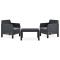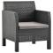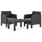 Salon de jardin 3 pcs avec coussins PP Rotin AnthraciteProfitez de votre temps de détente en plein air avec cet ensemble de salon de jardin. Cet ensemble de mobilier d'extérieur a une construction légère en polypropylène, ce qui le rend facile à nettoyer et convient à une utilisation dehors. Le coussin résistant aux UV inclus, le dossier ergonomique et l'accoudoir arrondi offrent un confort d'assise supplémentaire. La housse de coussin peut être retirée et lavée. En outre, la table est idéale pour placer de la nourriture et des boissons. Remarque : afin de prolonger la durée de vie des meubles d'extérieur, nous vous recommandons de les protéger avec une housse imperméable. Maximum 110 kg par siège. Soyez conscient du risque de feu ouvert et d'autres sources de forte chaleur à proximité de l'appareil.