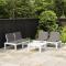 Salon de jardin 3 pcs avec coussins Plastique BlancCe salon de jardin est un excellent choix pour vous détendre et profiter du beau temps, faire une sieste ou discuter avec votre famille ou vos amis. L'ensemble de salon de jardin est en plastique, ce qui le rend facile à nettoyer et stable. Avec son dessus robuste, la table est idéale pour garder la nourriture et les boissons à portée de main. Le dossier et les coussins ajoutent au confort du banc.