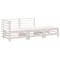 Salon de jardin 3 pcs blanc bois massif de pinCet ensemble de salon de jardin en bois avec un design à lattes sera un excellent complément à votre jardin, patio ou terrasse pour profiter d'un moment agréable avec votre famille ou vos amis. Bois de pin massif : le bois de pin massif est un matériau naturel magnifique. Le bois de pin a un grain droit et les noeuds donnent au matériau son aspect caractéristique et rustique. Cadre robuste et stable : les cadres en bois rendent l'ensemble de salon robuste et stable pour une utilisation quotidienne à l'extérieur. Expérience d'assise confortable : les dossiers ajoutent un confort d'assise supplémentaire à l'ensemble de mobilier de jardin. Conception modulaire : l'ensemble de meubles d'extérieur est flexible et facile à déplacer, vous pouvez le combiner avec d'autres segments modulaires dans notre boutique en ligne pour créer vos propres configurations d'ensemble de salon de jardin ! Bon à savoir : Pour que vos meubles d'extérieur restent beaux, nous vous recommandons de les protéger avec une housse imperméable. Maximum 110 kg par siège. ,