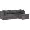 Salon de jardin 4 pcs avec coussins Gris Résine tresséeCet ensemble de salon de jardin est le complément parfait de votre arrière-cour, terrasse ou patio, offrant un espace confortable et accueillant pour discuter avec la famille et les amis ou simplement se détendre et profiter de l'extérieur. Matériau durable : la résine tressée, également connue sous le nom de poly rotin, est un matériau synthétique solide et nécessitant peu d'entretien qui ressemble au rotin naturel. Elle est légère, facile à nettoyer et couramment utilisée pour les meubles d'extérieur en raison de sa durabilité et de ses propriétés de résistance aux intempéries.Cadre robuste et stable : le cadre en acier enduit de poudre est solide, stable, durable et résistant à la corrosion et aux intempéries, ce qui garantit des performances durables.Pouf polyvalent : le tabouret est polyvalent, servant de repose-pieds confortable lorsque vous vous prélassez sur le canapé ou de siège supplémentaire dans votre jardin.Conception modulaire : cet ensemble de meubles d'extérieur a une conception modulaire, ce qui le rend complètement flexible et facile à déplacer, afin que vous puissiez créer un agencement de meubles d'extérieur personnalisé.Expérience d'assise confortable : ce mobilier d'extérieur, doté de coussins épais, offre une expérience d'assise confortable. Bon à savoir :Pour que vos meubles d'extérieur restent beaux, nous vous recommandons de les protéger avec une housse imperméable. Maximum 110 kg par siège.
