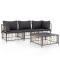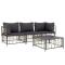 Salon de jardin 4 pcs avec coussins anthracite résine tresséeProfitez d'un moment de café confortable dans votre espace extérieur avec cet ensemble de salon de jardin ! C'est un complément parfait à votre jardin et à votre terrasse, créant une impression durable ! Matériau résistant aux intempéries : le poly rotin est résistant aux intempéries et facile à nettoyer. Il reste beau à l'extérieur pendant une longue période de temps. Il est plus économique que d'autres matériaux, tout en offrant une excellente qualité, une commodité et un aspect esthétique.Cadre robuste et stable : le cadre en acier de l'ensemble de salon assure robustesse et stabilité.Expérience d'assise confortable : le dossier ajoute un confort d'assise supplémentaire pour l'ensemble de salon. De plus, les coussins bien rembourrés offrent un confort pour votre temps d'assise.Dessus de table robuste : le dessus de table robuste de la table basse est parfait pour placer des repas, des boissons, des vases, des bols de fruits ou d'autres objets décoratifs.Conception modulaire : l'ensemble de salon de jardin est flexible et facile à déplacer, vous pouvez donc le combiner avec d'autres segments modulaires de la boutique en ligne pour créer vos propres configurations personnelles de salon de jardin ! Remarque :Pour que vos meubles d'extérieur restent beaux, nous vous recommandons de les protéger avec une housse imperméable. Maximum 110 kg par siège. Soyez conscient du risque de feu ouvert et d'autres sources de forte chaleur à proximité de l'appareil.