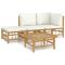 Salon de jardin 4 pcs avec coussins blanc crème bambouSavourez une tasse de café ou de thé par beau temps dans votre espace extérieur avec cet élégant ensemble de salon de jardin en bambou ! Matériau durable : le bambou est connu pour sa flexibilité et sa dureté. Les meubles en bambou sont une bonne option lorsque vous voulez des meubles d'extérieur solides fabriqués à partir de matériaux naturels.Expérience d'assise confortable : le dossier et l'accoudoir ajoutent un confort d'assise supplémentaire pour l'ensemble de canapé de jardin. De plus, les coussins d'assise et de dossier moelleux offrent un confort pendant votre temps d'assise.Table pratique : la table robuste est parfaite pour placer des repas, des boissons et d'autres objets décoratifs.Conception modulaire : l'ensemble de salon est flexible et facile à déplacer, vous pouvez donc le combiner avec d'autres segments modulaires dans la boutique en ligne pour créer vos propres configurations d'ensemble de salon d'extérieur ! Remarque :Pour que vos meubles d'extérieur restent beaux, nous vous recommandons de les protéger avec une housse imperméable.Bon à savoir :Pour faciliter au maximum le montage, chaque produit est livré avec des instructions.