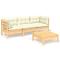 Salon de jardin 4 pcs avec coussins crème Bois de pinCe salon de jardin est un excellent choix pour vous détendre et profiter du beau temps, faire une sieste ou discuter avec votre famille ou vos amis. Le salon de patio est fabriqué en bois de pin massif, ce qui le rend robuste et stable. Les coussins ajoutent un confort supplémentaire. Vous pouvez le combiner avec d'autres segments modulaires pour créer vos propres configurations de salon de jardin ! Remarque : afin de prolonger la durée de vie des meubles d'extérieur, nous vous recommandons de les protéger avec une housse imperméable. Maximum 110 kg par siège.