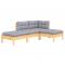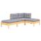 Salon de jardin 4 pcs avec coussins gris Bois de pin massifCe salon de jardin est un excellent choix pour vous détendre et profiter du beau temps, faire une sieste ou discuter avec votre famille ou vos amis. Le salon de patio est fabriqué en bois de pin massif, ce qui le rend robuste et stable. Les coussins ajoutent un confort supplémentaire. Vous pouvez le combiner avec d'autres segments modulaires pour créer vos propres configurations de salon de jardin ! Remarque : afin de prolonger la durée de vie des meubles d'extérieur, nous vous recommandons de les protéger avec une housse imperméable. Maximum 110 kg par siège.