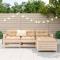 Salon de jardin 4 pcs bois massif de pinCet ensemble de salon de jardin en bois avec un design à lattes sera un excellent complément à votre jardin, patio ou terrasse pour profiter d'un moment agréable avec votre famille ou vos amis. Matériau robuste et durable : le bois de pin massif est connu pour sa résistance et sa durabilité. Ses grains droits et ses noeuds distinctifs contribuent à son charme rustique. Bien ventilé et prévention de l'accumulation d'eau : la conception à lattes favorise une circulation optimale de l'air et empêche efficacement l'accumulation d'eau, assurant ainsi une assise sèche et confortable. Utilisation polyvalente : le repose-pied de jardin peut non seulement être utilisé pour s'asseoir ou se détendre, mais il peut également être utilisé comme table basse pour contenir vos boissons, votre nourriture et d'autres décorations. Conception modulaire : cet ensemble de meubles d'extérieur a une conception modulaire, ce qui le rend complètement flexible et facile à déplacer, afin que vous puissiez créer un agencement de meubles d'extérieur personnalisé. Bon à savoir :Pour que vos meubles d'extérieur restent beaux, nous vous recommandons de les protéger avec une housse imperméable. Maximum 110 kg par siège.