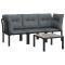 Salon de jardin 4 pcs noir et gris résine tresséeCet ensemble de salon de jardin tendance, au design élégant et contemporain, est un choix parfait pour vous détendre dans votre jardin. Matériau résistant aux intempéries : la résine tressée, également connue sous le nom de rotin poly, résiste aux intempéries et est facile à nettoyer. Elle reste belle à l'extérieur pendant une longue période. Elle offre une excellente qualité, commodité et un aspect esthétique. Cadre robuste et stable : le cadre en acier enduit de poudre de l'ensemble de salon garantit la robustesse et la stabilité. Conception modulaire : le salon d'extérieur est flexible et facile à déplacer, vous pouvez donc le combiner avec d'autres segments modulaires dans la boutique en ligne pour créer vos propres configurations d'ensemble de salon de jardin ! Expérience d'assise confortable : le dossier ajoute un confort d'assise supplémentaire à la chaise. De plus, les coussins bien rembourrés vous permettent de vous asseoir confortablement. Table pratique : le dessus robuste de la table basse de jardin est parfait pour placer des repas, des boissons et d'autres objets décoratifs. Bon à savoir : Pour faciliter au maximum le montage, chaque produit est livré avec des instructions. Remarque : Pour que vos meubles d'extérieur restent beaux, nous vous recommandons de les protéger avec une housse imperméable. Maximum 110 kg par siège. Soyez conscient du risque de feux ouverts et d'autres sources de forte chaleur à proximité du produit. ,
