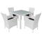 Salon de jardin 5 pcs Résine tressée Blanc-crèmeL'ensemble de mobilier de salle à manger en rotin a un design élégant et sera le point central de votre jardin, patio ou terrasse. Fabriqué en rotin synthétique résistant aux intempéries et imperméable et recouvert d'une couche de verre trempé sur le dessus de table, l'ensemble de salle à manger d'extérieur est facile à nettoyer, résistant à l'usure et adapté à une utilisation quotidienne. Le cadre en acier laqué rend la table très robuste et durable. Grace à la construction légère, tous les composants sont faciles à déplacer. Les coussins de siège amovibles et épais sont très confortables. Les housses des coussins avec fermetures éclair peuvent être facilement enlevées et lavées. La livraison comprend 1 table avec dessus de table en verre, 4 chaises et 4 coussins de siège amovibles. Remarque : nous vous recommandons de couvrir l'ensemble pendant la pluie, la neige et le gel.