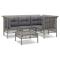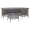 Salon de jardin 5 pcs avec coussins Gris Résine tresséeProfitez d'un moment de café confortable dans votre espace extérieur avec cet ensemble de salon de jardin ! C'est un complément parfait à votre jardin et à votre terrasse, créant une impression durable ! Matériau résistant aux intempéries : la résine tressée, également connue sous le nom de rotin poly, résiste aux intempéries et est facile à nettoyer. Elle reste belle à l'extérieur pendant une longue période. Elle offre une excellente qualité, commodité et un aspect esthétique.Cadre robuste : le cadre en acier enduit de poudre rend l'ensemble de salon d'extérieur robuste et stable pour une utilisation quotidienne à l'extérieur.Expérience d'assise confortable : les dossiers ajoutent un confort d'assise supplémentaire pour l'ensemble de salon de terrasse. De plus, les coussins bien rembourrés offrent du confort pendant votre temps d'assise.Conception modulaire : chaque article est flexible et facile à déplacer, vous pouvez donc la combiner avec d'autres segments modulaires dans la boutique en ligne pour créer vos propres configurations de salon de jardin ! Remarque :Pour que vos meubles d'extérieur restent beaux, nous vous recommandons de les protéger avec une housse imperméable. Maximum 110 kg par siège. Soyez conscient du risque de feu ouvert et d'autres sources de forte chaleur à proximité de l'appareil.