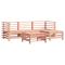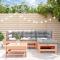 Salon de jardin 5 pcs avec coussins bois massif douglasCe salon de jardin en bois, qui se démarque par son design à lattes et ses coussins moelleux, sera un excellent supplément à votre jardin, patio ou terrasse pour profiter d'un moment agréable avec votre famille ou vos amis. Bois de douglas massif : le bois de douglas massif est un bois très durable qui fonctionne bien pour l'extérieur. Le bois de douglas est également suffisamment solide pour être travaillé avec un minimum de soin, même sous l'influence des intempéries.Cadre robuste et stable : le cadre en bois rend l'ensemble de salon robuste et stable pour une utilisation quotidienne à l'extérieur.Expérience d'assise confortable : le dossier et l'accoudoir ajoutent un confort d'assise supplémentaire à l'ensemble de meubles de jardin. De plus, les coussins bien rembourrés vous permettent de vous asseoir confortablement.Design modulaire : le canapé est flexible et facile à déplacer. Vous pouvez le combiner avec d'autres segments modulaires de la boutique en ligne pour créer vos propres configurations de salon de jardin ! Bon à savoir :Pour que vos meubles d'extérieur restent beaux, nous vous recommandons de les protéger avec une housse imperméable. Maximum 110 kg par siège.