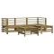 Salon de jardin 5 pcs avec coussins bois de pin imprégnéCe salon de jardin en bois, qui se démarque par son design à lattes et ses coussins moelleux, sera un excellent supplément à votre jardin, patio ou terrasse pour profiter d'un moment agréable avec votre famille ou vos amis. Bois imprégné : le bois de pin massif est un matériau naturel magnifique. Le bois de pin a un grain droit et les noeuds lui confèrent un aspect rustique caractéristique. L'imprégnation est un processus de conservation réalisé à l'aide d'autoclaves. Le traitement sous pression augmente la résistance à la pourriture et aux intempéries. Expérience d'assise confortable : le dossier et l'accoudoir ajoutent un confort d'assise supplémentaire à l'ensemble de meubles de jardin. De plus, les coussins bien rembourrés vous permettent de vous asseoir confortablement. Design modulaire : le canapé est flexible et facile à déplacer. Vous pouvez le combiner avec d'autres segments modulaires de la boutique en ligne pour créer vos propres configurations de salon de jardin ! Bon à savoir : Pour que vos meubles d'extérieur restent beaux, nous vous recommandons de les protéger avec une housse imperméable. Maximum 110 kg par siège.