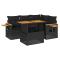Salon de jardin 5 pcs avec coussins noir résine tressée acaciaCet ensemble de canapés de jardin est le complément parfait de votre arrière-cour, terrasse ou patio, offrant un espace confortable et accueillant pour discuter avec la famille et les amis ou simplement se détendre et profiter de l'extérieur. Matériau durable : la résine tressée, également connue sous le nom de poly rotin, est un matériau synthétique solide et nécessitant peu d'entretien qui ressemble au rotin naturel. Elle est légère, facile à nettoyer et couramment utilisée pour les meubles d'extérieur en raison de sa durabilité et de ses propriétés de résistance aux intempéries.Fonction de rangement avec sac résistant à l'eau : chaque siège de jardin dispose d'un espace de rangement sous l'assise, complété par un sac résistant à l'eau pour ranger les coussins, les jouets et d'autres objets. Les sacs intérieurs sont dotés d'un couvercle et peuvent être solidement fixés aux sièges à l'aide de bandes auto-agrippantes pour plus de stabilité.Table d'appoint pratique : ce mobilier d'extérieur comprend une table d'appoint pliable avec un ressort à gaz, offrant un endroit pratique pour garder vos essentiels à portée de main.Housse amovible et lavable : ces coussins de siège sont dotés de housses amovibles pour un lavage et un entretien faciles.Conception modulaire : cet ensemble de meubles d'extérieur a une conception modulaire, ce qui le rend complètement flexible et facile à déplacer, afin que vous puissiez créer un agencement de meubles d'extérieur personnalisé. Bon à savoir :Pour que vos meubles d'extérieur restent beaux, nous vous recommandons de les protéger avec une housse imperméable.