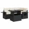 Salon de jardin 5 pcs avec coussins noir résine tresséeCet ensemble de canapés de jardin est le complément parfait de votre arrière-cour, terrasse ou patio, offrant un espace confortable et accueillant pour discuter avec la famille et les amis ou simplement se détendre et profiter de l'extérieur. Matériau durable : la résine tressée, également connue sous le nom de poly rotin, est un matériau synthétique solide et nécessitant peu d'entretien qui ressemble au rotin naturel. Elle est légère, facile à nettoyer et couramment utilisée pour les meubles d'extérieur en raison de sa durabilité et de ses propriétés de résistance aux intempéries.Fonction de rangement avec sac résistant à l'eau : chaque siège de jardin dispose d'un espace de rangement sous l'assise, complété par un sac résistant à l'eau pour ranger les coussins, les jouets et d'autres objets. Le sac intérieur est doté d'un couvercle et peut être solidement fixé au siège à l'aide de bandes auto-agrippantes pour plus de stabilité.Dessus de table réglable : le dessus de table peut être soulevé pour rendre la table plus haute, ce qui transforme la table d'extérieur d'une table basse à une table de salle à manger. Elle est parfaite pour recevoir des invités ou prendre des repas à l'extérieur.Housse amovible et lavable : ces coussins de siège sont dotés de housses amovibles pour un lavage et un entretien faciles.Cadre robuste et stable : le cadre en acier enduit de poudre est solide, stable, durable et résistant à la corrosion et aux intempéries, ce qui garantit des performances durables. Bon à savoir :Pour que vos meubles d'extérieur restent beaux, nous vous recommandons de les protéger avec une housse imperméable.