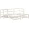 Salon de jardin 5 pcs blanc bois massif de pinCe salon de jardin en bois, qui se démarque par son design à lattes, sera un excellent supplément à votre jardin, patio ou terrasse pour profiter d'un moment agréable avec votre famille ou vos amis. Bois de pin massif : le bois de pin massif est un matériau naturel magnifique. Le bois de pin a un grain droit et les noeuds donnent au matériau son aspect caractéristique et rustique.Cadre robuste et stable : les cadres en bois rendent l'ensemble de salon robuste et stable pour une utilisation quotidienne à l'extérieur.Design modulaire : le canapé est flexible et facile à déplacer. Vous pouvez le combiner avec d'autres segments modulaires de la boutique en ligne pour créer vos propres configurations de salon de jardin ! Bon à savoir :Pour que vos meubles d'extérieur restent beaux, nous vous recommandons de les protéger avec une housse imperméable.Les coussins ne sont pas inclus dans la livraison. Maximum 110 kg par siège.