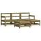 Salon de jardin 5 pcs bois de pin imprégnéCe salon de jardin en bois, qui se démarque par son design à lattes, sera un excellent supplément à votre jardin, patio ou terrasse pour profiter d'un moment agréable avec votre famille ou vos amis. Bois imprégné : le bois de pin massif est un matériau naturel magnifique. Le bois de pin a un grain droit et les noeuds lui confèrent un aspect rustique caractéristique. L'imprégnation est un processus de conservation réalisé à l'aide d'autoclaves. Le traitement sous pression augmente la résistance à la pourriture et aux intempéries.Cadre robuste et stable : les cadres en bois rendent l'ensemble de salon robuste et stable pour une utilisation quotidienne à l'extérieur.Design modulaire : le canapé est flexible et facile à déplacer. Vous pouvez le combiner avec d'autres segments modulaires de la boutique en ligne pour créer vos propres configurations de salon de jardin ! Bon à savoir :Pour que vos meubles d'extérieur restent beaux, nous vous recommandons de les protéger avec une housse imperméable.Les coussins ne sont pas inclus dans la livraison. Maximum 110 kg par siège.