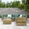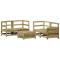 Salon de jardin 5 pcs bois de pin imprégnéCet ensemble de salon de jardin en bois avec un design à lattes sera un excellent complément à votre jardin, patio ou terrasse pour profiter d'un moment agréable avec votre famille ou vos amis. Matériau robuste et durable : le bois de pin massif est connu pour sa résistance et sa durabilité. Ses grains droits et ses noeuds distinctifs contribuent à son charme rustique. Il a été imprégné avec une solution de conservation et a subi un traitement en autoclave, ce qui renforce sa résistance à la pourriture et aux intempéries. Bien ventilé et prévention de l'accumulation d'eau : la conception à lattes favorise une circulation optimale de l'air et empêche efficacement l'accumulation d'eau, assurant ainsi une assise sèche et confortable. Utilisation polyvalente : le repose-pied de jardin peut non seulement être utilisé pour s'asseoir ou se détendre, mais il peut également être utilisé comme table basse pour contenir vos boissons, votre nourriture et d'autres décorations. Table d'appoint pratique : ce mobilier d'extérieur comprend une table d'appoint pliable avec un ressort à gaz sur les accoudoirs, offrant un endroit pratique pour garder vos essentiels à portée de main. Conception modulaire : cet ensemble de meubles d'extérieur a une conception modulaire, ce qui le rend complètement flexible et facile à déplacer, afin que vous puissiez créer un agencement de meubles d'extérieur personnalisé. Bon à savoir : Pour que vos meubles d'extérieur restent beaux, nous vous recommandons de les protéger avec une housse imperméable. Maximum 110 kg par siège.