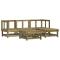 Salon de jardin 5 pcs bois de pin imprégnéCe salon de jardin en bois, qui se démarque par son design à lattes, sera un excellent supplément à votre jardin, patio ou terrasse pour profiter d'un moment agréable avec votre famille ou vos amis. Bois imprégné : le bois de pin massif est un matériau naturel magnifique. Le bois de pin a un grain droit et les noeuds lui confèrent un aspect rustique caractéristique. L'imprégnation est un processus de conservation réalisé à l'aide d'autoclaves. Le traitement sous pression augmente la résistance à la pourriture et aux intempéries. Cadre robuste et stable : les cadres en bois rendent l'ensemble de salon robuste et stable pour une utilisation quotidienne à l'extérieur. Design modulaire : le canapé est flexible et facile à déplacer. Vous pouvez le combiner avec d'autres segments modulaires de la boutique en ligne pour créer vos propres configurations de salon de jardin ! Bon à savoir : Pour que vos meubles d'extérieur restent beaux, nous vous recommandons de les protéger avec une housse imperméable. Les coussins ne sont pas inclus dans la livraison. Maximum 110 kg par siège.