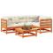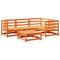Salon de jardin 5 pcs cire marron bois de pin massifCet ensemble de canapés de jardin est le complément parfait de votre arrière-cour, terrasse ou patio, offrant un espace confortable et accueillant pour discuter avec la famille et les amis ou simplement se détendre et profiter de l'extérieur. Matériau robuste et durable : le bois de pin massif est connu pour sa résistance et sa durabilité. Ses grains droits et ses noeuds distinctifs contribuent à son charme rustique.Bien ventilé et prévention de l'accumulation d'eau : la conception à lattes favorise une circulation optimale de l'air et empêche efficacement l'accumulation d'eau, assurant ainsi une assise sèche et confortable.Conception modulaire : cet ensemble de meubles d'extérieur a une conception modulaire, ce qui le rend complètement flexible et facile à déplacer, afin que vous puissiez créer un agencement de meubles d'extérieur personnalisé. Bon à savoir :Pour que vos meubles d'extérieur restent beaux, nous vous recommandons de les protéger avec une housse imperméable. Maximum 110 kg par siège.