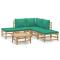 Salon de jardin 6 pcs avec coussins vert bambouSavourez une tasse de café ou de thé par beau temps dans votre espace extérieur avec cet élégant ensemble de salon de jardin en bambou ! Matériau durable : le bambou est connu pour sa flexibilité et sa dureté. Les meubles en bambou sont une bonne option lorsque vous voulez des meubles d'extérieur solides fabriqués à partir de matériaux naturels.Expérience d'assise confortable : le dossier et l'accoudoir ajoutent un confort d'assise supplémentaire pour l'ensemble de canapé de jardin. De plus, les coussins d'assise et de dossier moelleux offrent un confort pendant votre temps d'assise.Table pratique : la table robuste est parfaite pour placer des repas, des boissons et d'autres objets décoratifs.Conception modulaire : l'ensemble de salon est flexible et facile à déplacer, vous pouvez donc le combiner avec d'autres segments modulaires dans la boutique en ligne pour créer vos propres configurations d'ensemble de salon d'extérieur ! Remarque :Pour que vos meubles d'extérieur restent beaux, nous vous recommandons de les protéger avec une housse imperméable.Bon à savoir :Pour faciliter au maximum le montage, chaque produit est livré avec des instructions.