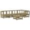 Salon de jardin 6 pcs bois de pin imprégné Ce salon de jardin en bois, qui se démarque par son design à lattes, sera un excellent supplément à votre jardin, patio ou terrasse pour profiter d'un moment agréable avec votre famille ou vos amis. Bois imprégné : le bois de pin massif est un matériau naturel magnifique. Le bois de pin a un grain droit et les noeuds lui confèrent un aspect rustique caractéristique. L'imprégnation est un processus de conservation réalisé à l'aide d'autoclaves. Le traitement sous pression augmente la résistance à la pourriture et aux intempéries.Expérience d'assise confortable : le dossier ajoute un confort d'assise supplémentaire au canapé d'extérieur.Design modulaire : le canapé est flexible et facile à déplacer. Vous pouvez le combiner avec d'autres segments modulaires de la boutique en ligne pour créer vos propres configurations de salon de jardin ! Bon à savoir :Pour que vos meubles d'extérieur restent beaux, nous vous recommandons de les protéger avec une housse imperméable.Les coussins ne sont pas inclus dans la livraison. Maximum 110 kg par siège.