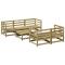 Salon de jardin 6 pcs bois de pin imprégnéCet ensemble de canapés de jardin est le complément parfait de votre arrière-cour, terrasse ou patio, offrant un espace confortable et accueillant pour discuter avec la famille et les amis ou simplement se détendre et profiter de l'extérieur. Matériau robuste et durable : le bois de pin massif est connu pour sa résistance et sa durabilité. Ses grains droits et ses noeuds distinctifs contribuent à son charme rustique. Il a été imprégné avec une solution de conservation et a subi un traitement en autoclave, ce qui renforce sa résistance à la pourriture et aux intempéries. Bien ventilé et prévention de l'accumulation d'eau : la conception à lattes favorise une circulation optimale de l'air et empêche efficacement l'accumulation d'eau, assurant ainsi une assise sèche et confortable. Conception modulaire : cet ensemble de meubles d'extérieur a une conception modulaire, ce qui le rend complètement flexible et facile à déplacer, afin que vous puissiez créer un agencement de meubles d'extérieur personnalisé. Bon à savoir :Pour que vos meubles d'extérieur restent beaux, nous vous recommandons de les protéger avec une housse imperméable. Maximum 110 kg par siège.