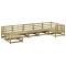 Salon de jardin 7 pcs bois de pin imprégnéCet ensemble de canapés de jardin est le complément parfait de votre arrière-cour, terrasse ou patio, offrant un espace confortable et accueillant pour discuter avec la famille et les amis ou simplement se détendre et profiter de l'extérieur. Matériau robuste et durable : le bois de pin massif est connu pour sa résistance et sa durabilité. Ses grains droits et ses noeuds distinctifs contribuent à son charme rustique. Il a été imprégné avec une solution de conservation et a subi un traitement en autoclave, ce qui renforce sa résistance à la pourriture et aux intempéries.Bien ventilé et prévention de l'accumulation d'eau : la conception à lattes favorise une circulation optimale de l'air et empêche efficacement l'accumulation d'eau, assurant ainsi une assise sèche et confortable.Conception modulaire : cet ensemble de meubles d'extérieur a une conception modulaire, ce qui le rend complètement flexible et facile à déplacer, afin que vous puissiez créer un agencement de meubles d'extérieur personnalisé. Bon à savoir :Pour que vos meubles d'extérieur restent beaux, nous vous recommandons de les protéger avec une housse imperméable. Maximum 110 kg par siège.