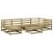Salon de jardin 7 pcs bois de pin imprégnéCet ensemble de canapés de jardin est le complément parfait de votre arrière-cour, terrasse ou patio, offrant un espace confortable et accueillant pour discuter avec la famille et les amis ou simplement se détendre et profiter de l'extérieur. Matériau robuste et durable : le bois de pin massif est connu pour sa résistance et sa durabilité. Ses grains droits et ses noeuds distinctifs contribuent à son charme rustique. Il a été imprégné avec une solution de conservation et a subi un traitement en autoclave, ce qui renforce sa résistance à la pourriture et aux intempéries.Bien ventilé et prévention de l'accumulation d'eau : la conception à lattes favorise une circulation optimale de l'air et empêche efficacement l'accumulation d'eau, assurant ainsi une assise sèche et confortable.Conception modulaire : cet ensemble de meubles d'extérieur a une conception modulaire, ce qui le rend complètement flexible et facile à déplacer, afin que vous puissiez créer un agencement de meubles d'extérieur personnalisé. Bon à savoir :Pour que vos meubles d'extérieur restent beaux, nous vous recommandons de les protéger avec une housse imperméable. Maximum 110 kg par siège.