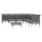 Salon de jardin 8 pcs avec coussins Gris Résine tresséeProfitez d'un moment de café confortable dans votre espace extérieur avec cet ensemble de salon de jardin ! C'est un complément parfait à votre jardin et à votre terrasse, créant une impression durable ! Matériau résistant aux intempéries : la résine tressée, également connue sous le nom de rotin poly, résiste aux intempéries et est facile à nettoyer. Elle reste belle à l'extérieur pendant une longue période. Elle offre une excellente qualité, commodité et un aspect esthétique.Cadre robuste : le cadre en acier enduit de poudre rend l'ensemble de salon d'extérieur robuste et stable pour une utilisation quotidienne à l'extérieur.Expérience d'assise confortable : les dossiers ajoutent un confort d'assise supplémentaire pour l'ensemble de salon de terrasse. De plus, les coussins bien rembourrés offrent du confort pendant votre temps d'assise.Conception modulaire : chaque article est flexible et facile à déplacer, vous pouvez donc la combiner avec d'autres segments modulaires dans la boutique en ligne pour créer vos propres configurations de salon de jardin ! Remarque :Pour que vos meubles d'extérieur restent beaux, nous vous recommandons de les protéger avec une housse imperméable. Maximum 110 kg par siège. Soyez conscient du risque de feu ouvert et d'autres sources de forte chaleur à proximité de l'appareil.